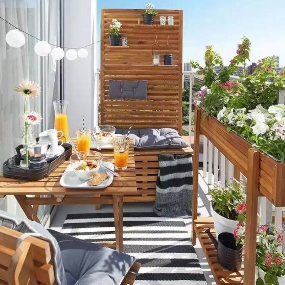 如果家中落地阳台够大,不妨选购一张与室内家具色彩一致或截然相反户外休闲桌,再配上两个四方矮凳,并在其旁边装点上几盆绿色植物,不仅能让窄小的阳台变得宽敞一些,还能刻意营造出一个四合小院的景致。