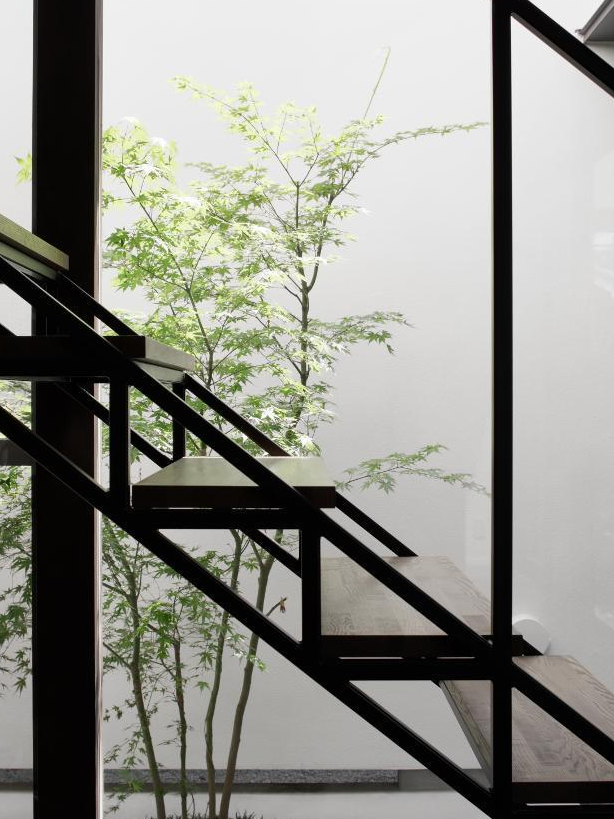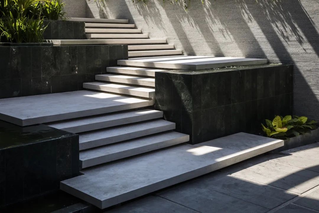 下沉式庭院利用坡差营造出一种曲径通幽的意境美,相较于平层的设计,多了各种造型和植被的分割,让空间在视觉上变得更有层次感,空间的布局也横生了不少乐趣。