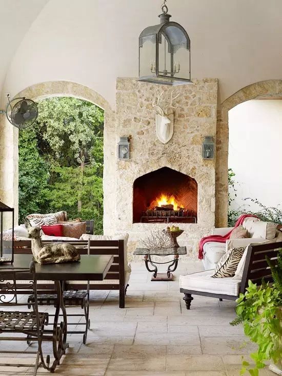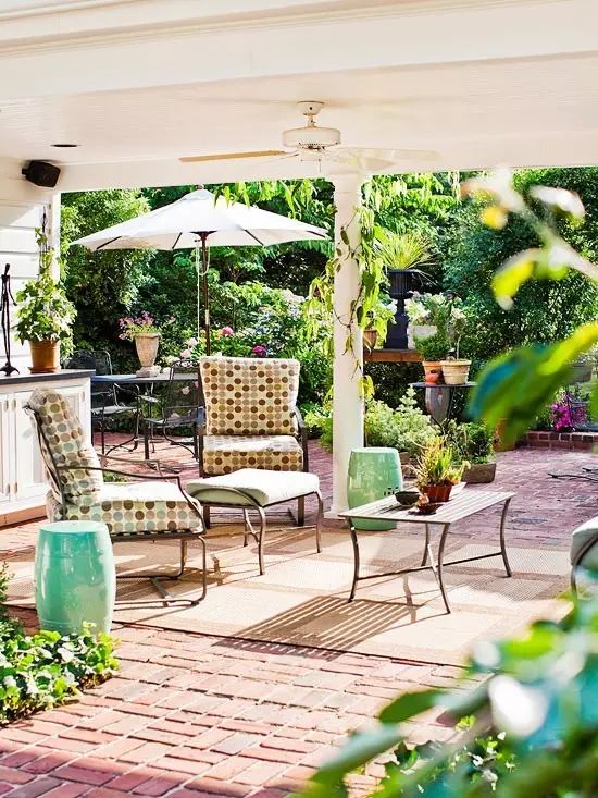天井,本来能起到庇护的原理作用,不幸的是,却挡住了夏天冷却的微风。如果你有一个开放式的结构——一个真正的屋顶或棚架,你可以在其顶上设置一个吊扇,它可以帮忙降低高达10度的温度。在吊扇边装一盏灯,还将有一个可靠的架空照明光源。青岛别墅庭院设计