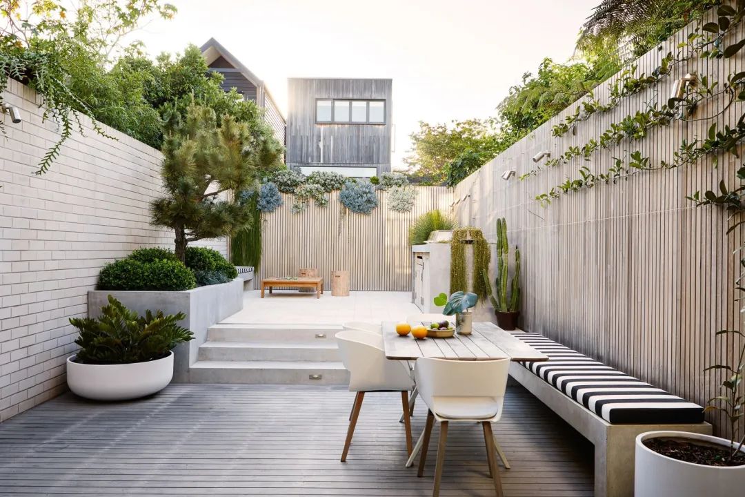 为了避免空洞,可以采用组合型铺装来搭配,例如石板+木平台/小面积草坪,硬化面积建议不宜超过场地的70%,否则会带来生硬冰冷的视觉。余下的空间作为绿化面积搭配,平衡视觉,同时种植一些低维护的绿植是最适合的。