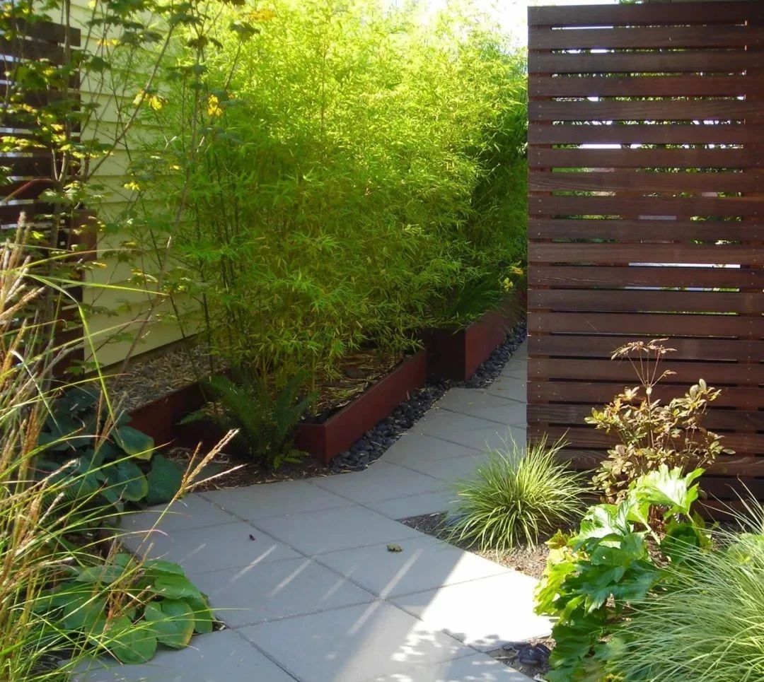 竹子在庭院中不适合大片的种,否则很容易遮光,影响庭院的采光。一般种在墙隅里比较合适,少量的竹子可以起到点缀的作用,也能凸显庭院主人的气节品格。