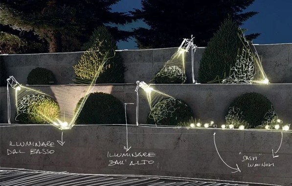 庭院灯光设计的装饰作用可以通过灯具自身的造型质感以及灯具的排列组合,对空间起到点缀或者强化作用。