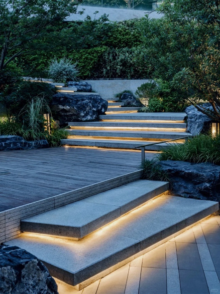 庭院道路与台阶的灯光设计主要是保证夜晚行走的安全性。一般使用灯带或是低矮迷你射灯,也可安装凹陷的铺路灯,将光照射在路上或路的边缘,不仅可以照明道路,还具有美观的效果。