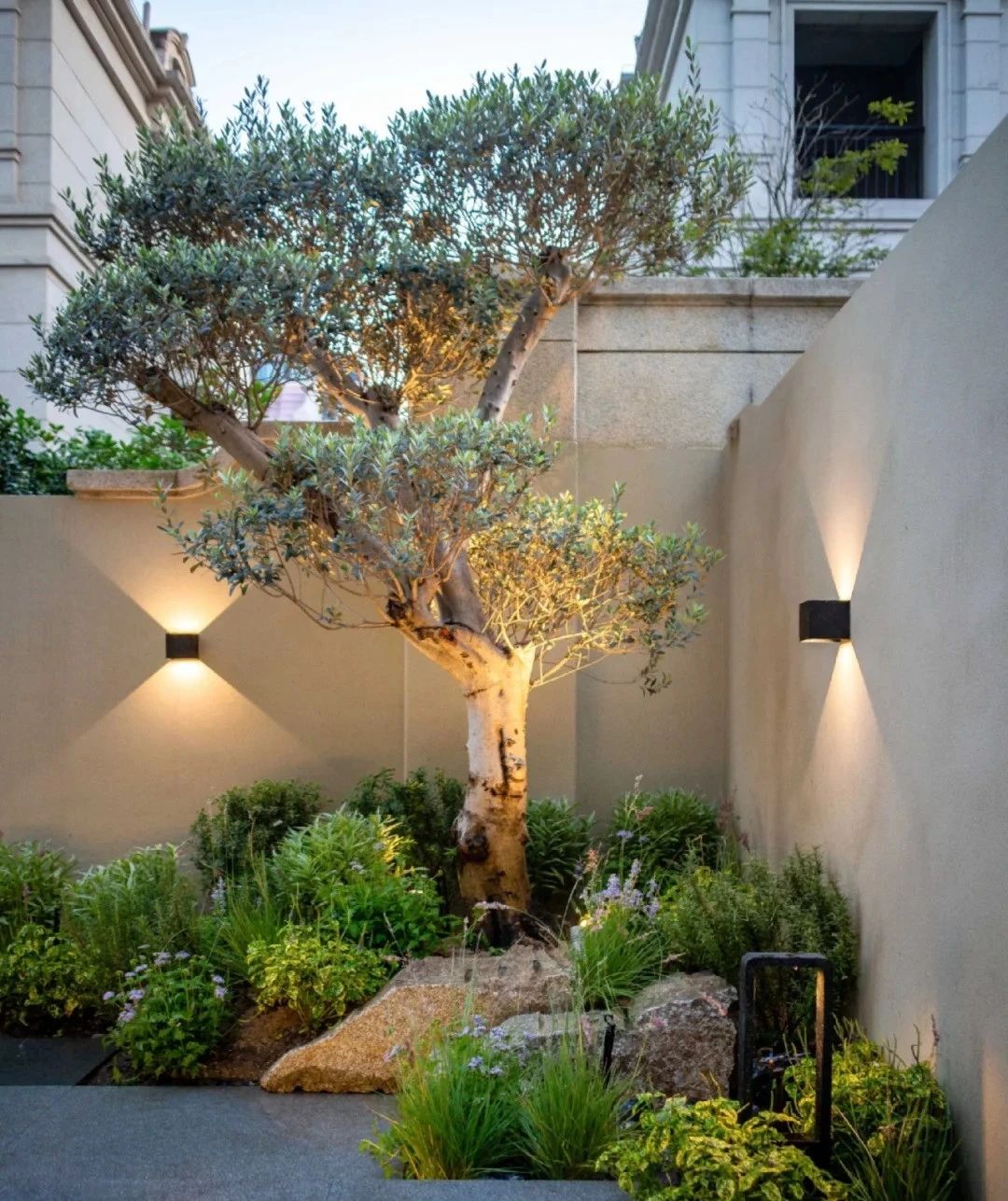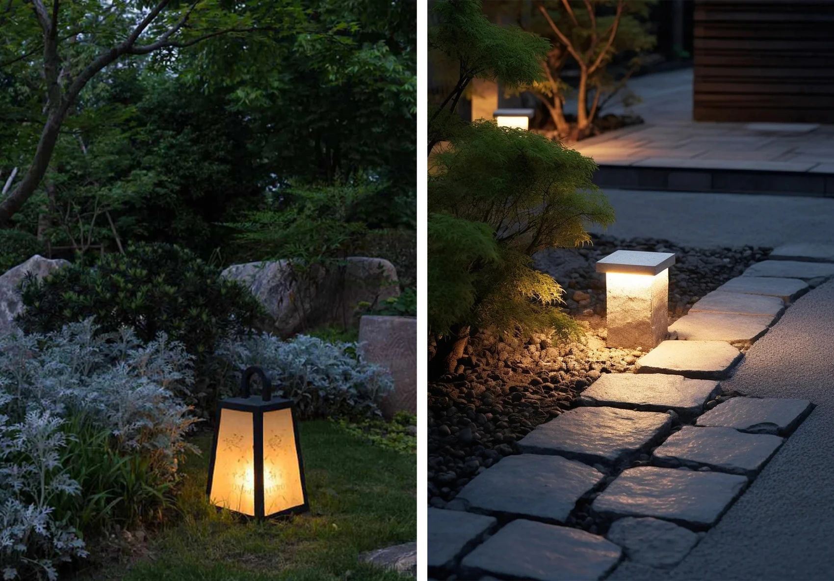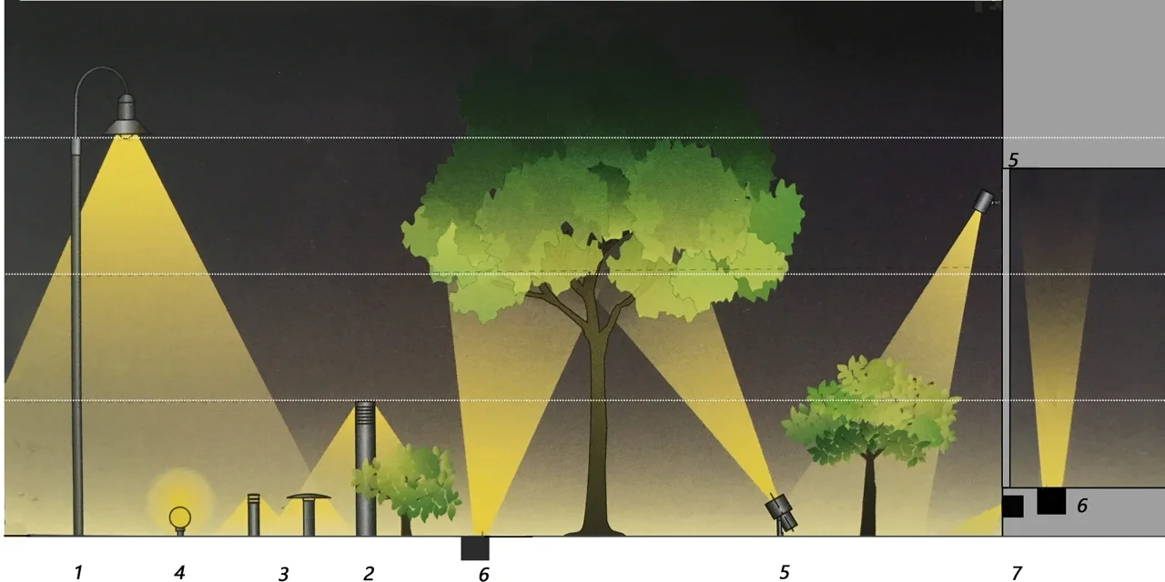 使用不同类型和高度的灯具来营造多个照明层次,包括整体照明、局部照明和装饰照明。整体照明提供基本照明,局部照明用于特定区域或功能,装饰照明用于突出庭院的特点和景观。