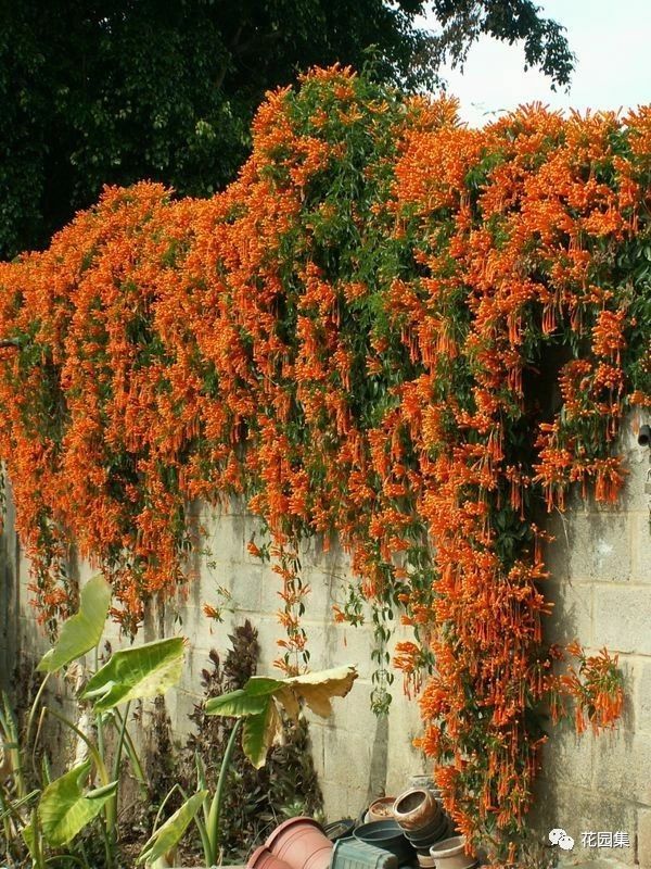 炮仗花也是一种应用很广的藤本植物。很多人都很喜欢用炮仗花来装饰露台,炮仗花的花名由来,我觉得一定是因为它的花朵比较像炮仗,所以才得名的,橙红色的鲜艳小花,配上又嫩又脆的叶片和茎蔓,真的十分亮眼,装饰露台活泼又喜庆!